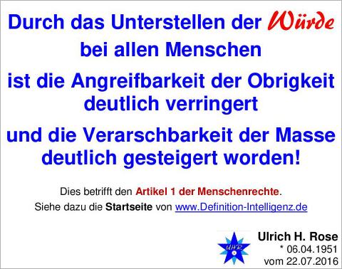 Durch das Unterstellen der Würde bei allen ... Durch das Unterstellen der Würde bei allen Menschen ist die Angreifbarkeit der Obrigkeit deutlich verringert und die Verarschbarkeit der Masse deutlcih gesteigert worden. Spruch von Ulrich H. Rose vom 22.07.2016