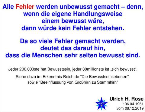Alle Fehler werden unbewusst gemacht – denn ... Alle Fehler werden unbewusst gemacht – denn, wenn die eigene Handlungsweise einem bewusst wäre, dann würde kein Fehler entstehen. Da so viele Fehler gemacht werden, deutet das darauf hin, dass die Menschen sehr selten bewusst sind. Jeder 200.000ste hat Bewusstsein, jeder 30millionste ist sich bewusst. Siehe dazu "Die Bewusstseinsebenen", sowie "Beeinflussung von Großhirn zu Stammhirn" Spruch von Ulrich H. Rose vom 08.12.2019