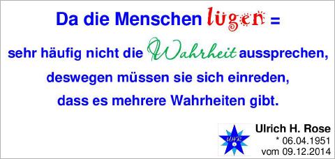 Diese Welt lebte bisher und heutzutage noch ... Diese Welt lebte bisher und heutzutage noch viel mehr von der Lüge, und nicht von der Wahrheit. Spruch von Ulrich H. Rose vom 18.07.2020