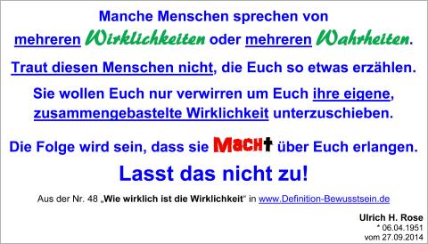 Unsere Politiker und Wissenschaftler, die ... Unsere Politiker und Wissenschaftler, die behaupten, dass es einen berechtigten Grund für eine Pandemie 2020 gab, sind Verschwörer gegen das Volk. Dieser Satz musste sein, da der Begriff "Verschwörungstheoretiker" im Zusammenhang mit Corona zu häufig und auch falsch - von der Seite der Verschwörer gegen die Aufklärer - verwendet wurde. Wer das Volk ungerechtfertigt und mit Lügen zu Hause einsperrt, und es danach mit unnützen und eher schädlichen Masken in die dann eingeschränkte Freiheit durch Grundgesetzmissbrauch entlässt, der ist zu Recht als Verschwörer gegen das Volk zu bezeichnen. Gedankenextrakt von Ulrich H. Rose vom 11.07.2020