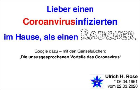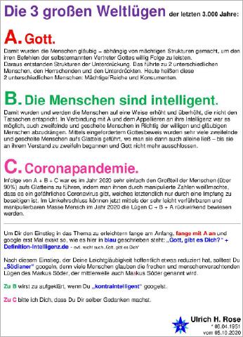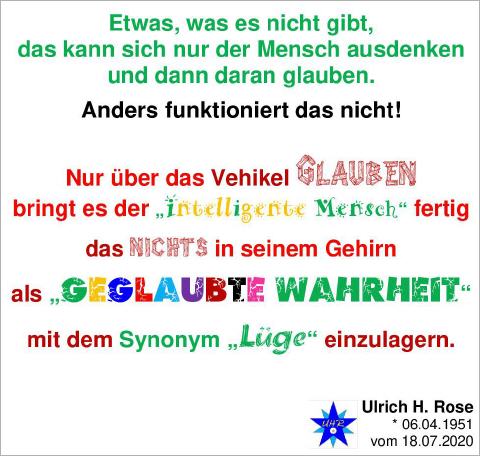 Jens Spahn klammert sich glaubend an das Corona... Jens Spahn klammert sich glaubend an das Coronavirus und trägt dies überzeugend vor. Bodo Schiffmann klammert sich glaubend an Gott und trägt dies überzeugend vor. Über den Glauben - egal an was auch immer - Probleme aufzuzeigen und zu beheben, bedeutet nichts anderes, als über den holprigen Weg des eigenen Glaubens Ideologien (an die geglaubt wird?) zu kritisieren. Das ist nicht zielführend! Mit dem eigenen Glauben einen anderen Glauben zu kritisieren ist Schwachsinn auf höchstem Niveau. Zielführend wäre sachliche Kritik - ohne Glaubensinhalte - vorzutragen! Gedankenextrakt von Ulrich H. Rose vom 18.12.2020